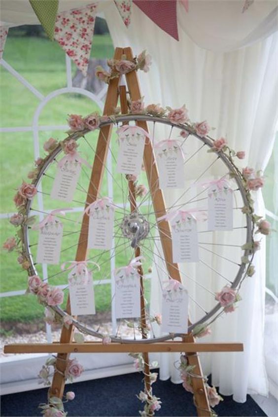 Une autre idée insolite : qui aurait cru qu'une jante de vélo pouvait donner un plan de table aussi charmant? Un peu de déco, des fleurs ou quelques bandes de papier de soie, et le tour est joué!